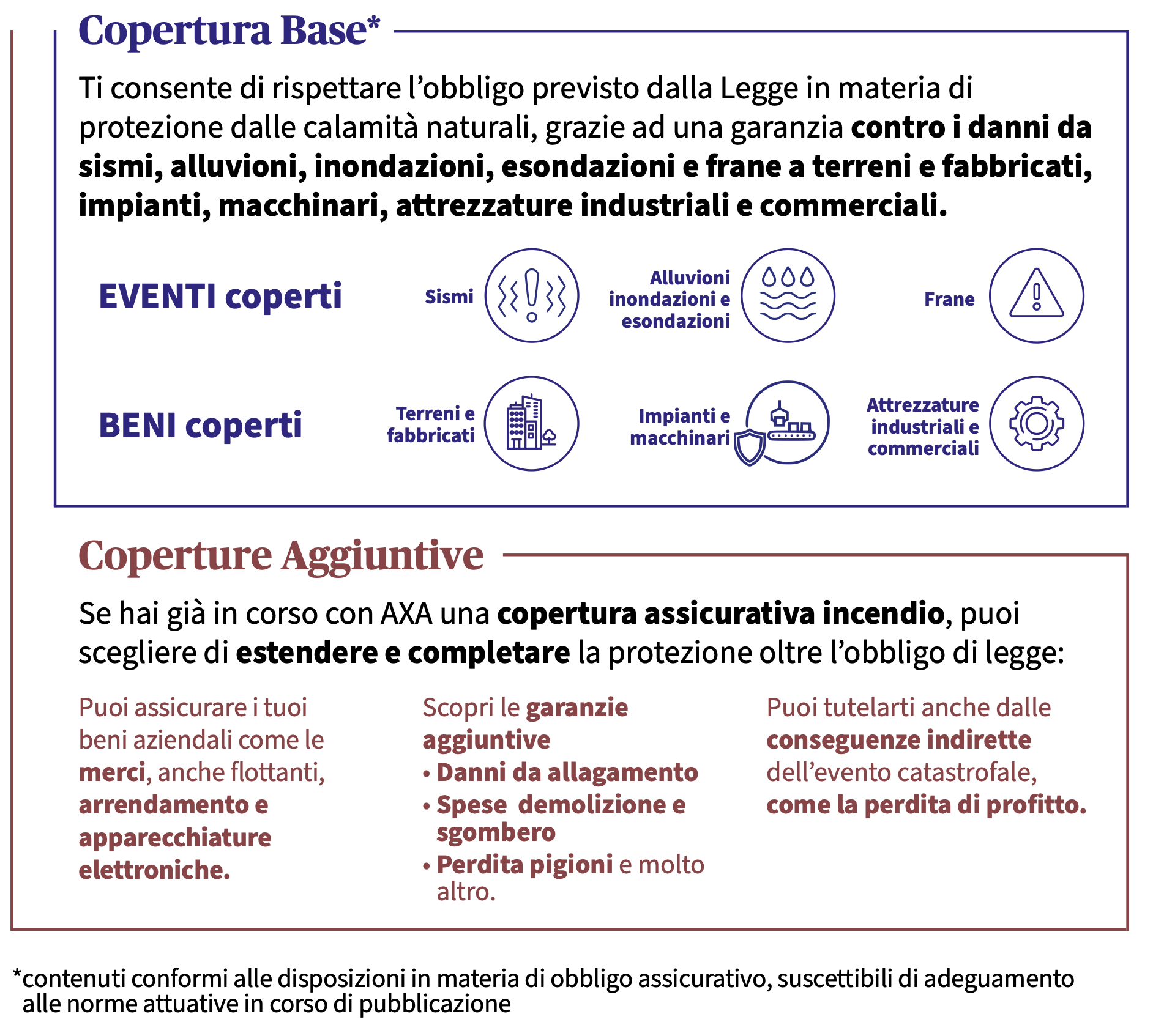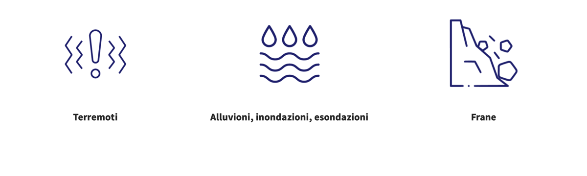 La garanzia che ti copre contro i danni da sismi, alluvioni, inondazioni, esondazioni e frane a terreni e fabbricati, impianti, macchinari, attrezzature industriali e commerciali, è ispirata alle disposizioni in materia di obbligo assicurativo, suscettibili di adeguamento alle norme attuative in corso di pubblicazione.